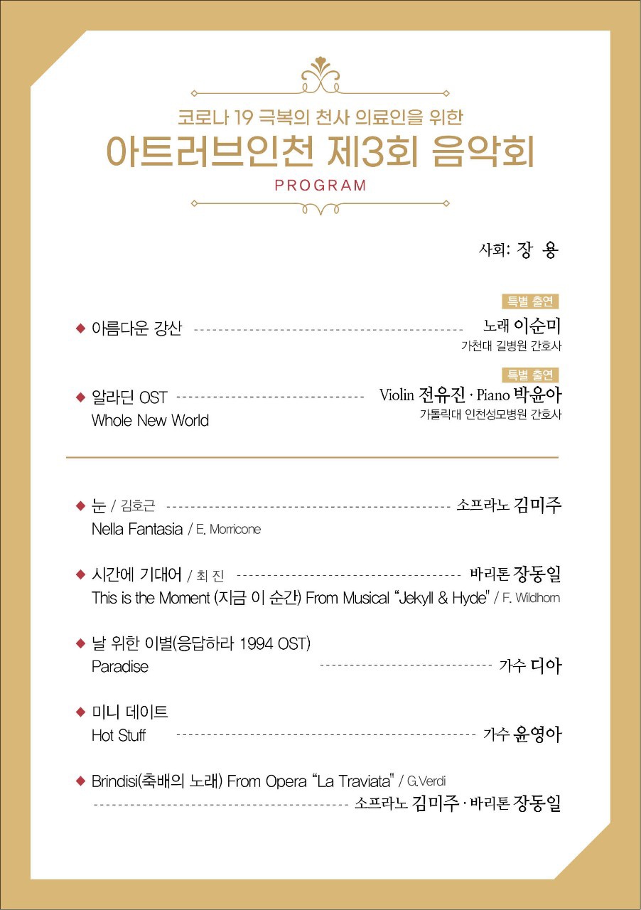 "문화예술의 향기를 시민과 함께" 아트러브인천에서 제3회 음악회를 무대에 올렸습니다. 코로나19 극복의 천사 의료인을 위한 힐링 음악회로 아트러브인천이 주최하고 인천간호사회가 주관하였습니다.