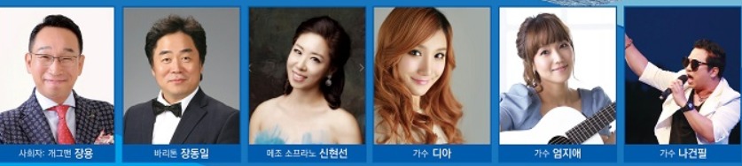 ▲ 왼쪽부터 아트러브인천 음악회에 출연하는 개그맨 장용, 바리톤 장동일, 메조 소프라노 신현선, 가수 디아, 가수 엄지애, 가수 나건필. /사진제공=아트러브인천