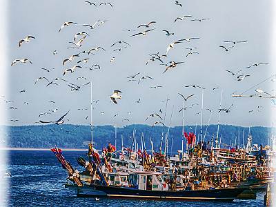 어선의 귀항을 제일먼저 반기는 것은 갈매기들이네요!