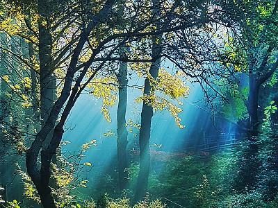 을에 피는 꽃과 신비로운 블루 빛의 빛 내림