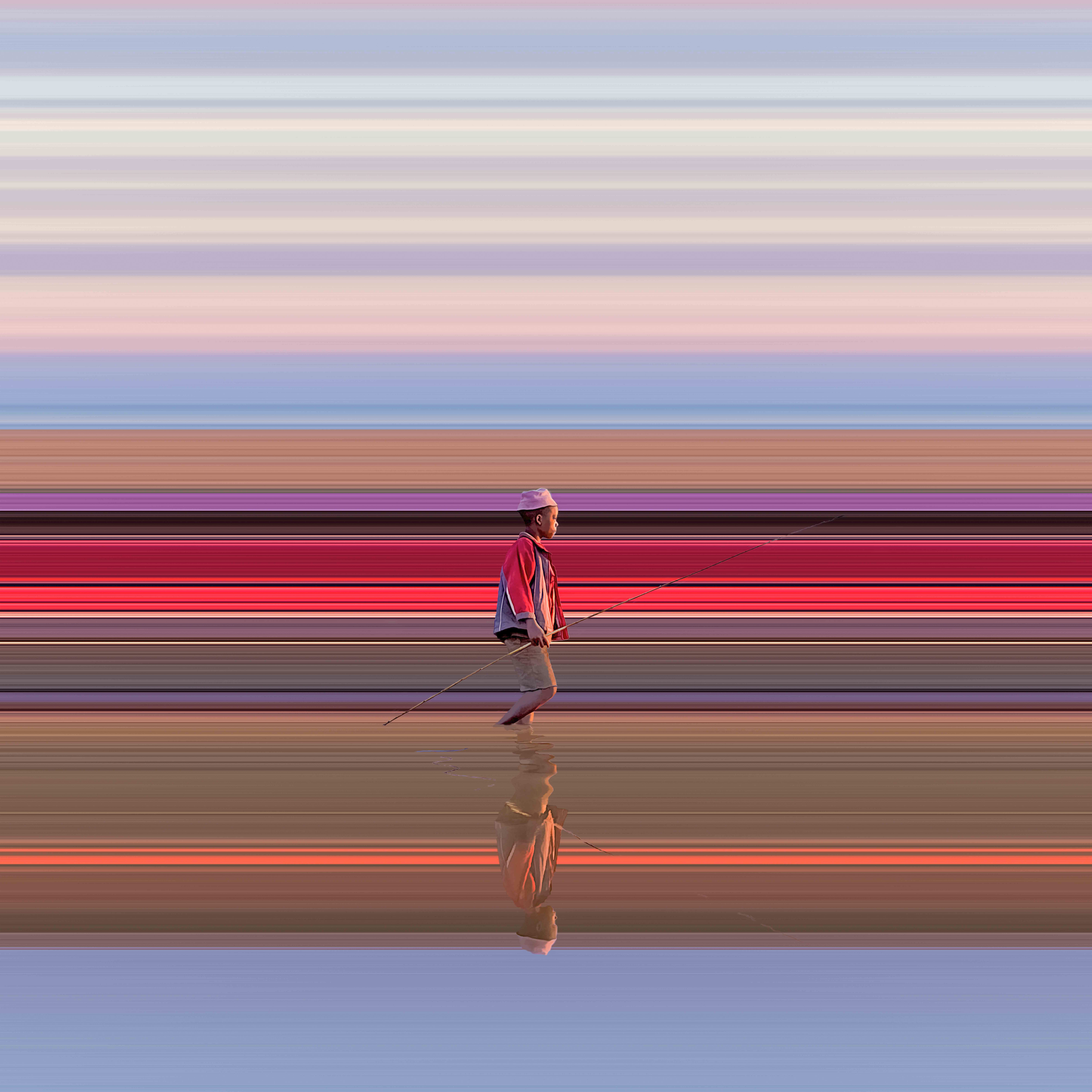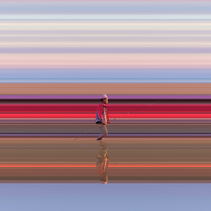 해가 뜨기 직전부터 물고기를 잡기 위해 호수로 들어서는 소년의 모습을 표현했습니다.