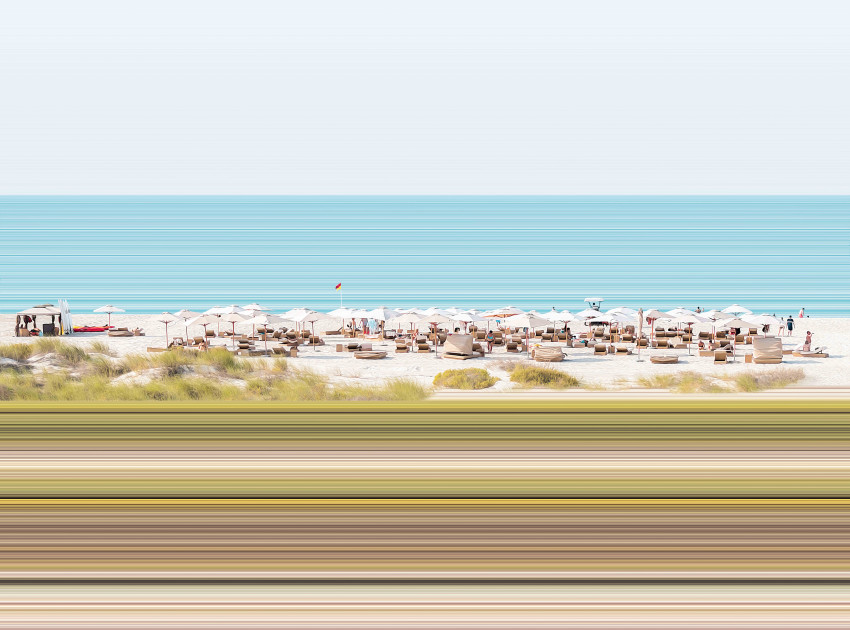 아부다비로 취재를 갔을 때였습니다. 다음 촬영 장소로 이동하기 전, 호텔에 체크인을 먼저 하게 되었습니다. 캐리어를 끌고 엘리베이터로 이동하려는데 창밖으로 펼쳐진 해변이 눈에 들어왔습니다. 하얀 파라솔과 모래, 그리고 푸른 바다를 배경으로 여유를 즐기고 있는 사람들의 모습은 마치 다른 세상에 있는 것처럼 느껴졌습니다. 지상 낙원이라는 말과 너무 잘 어울리는 장면이었습니다. 마사이 여인들을 촬영할 때는 과거로 가는 기분이었다면 이 장면은 같은 시간에 전혀 다른 차원으로 이동하는 느낌을 받았습니다. 하지만 아무나 갈 수 없을 것 같은 기분도 동시에 들어서 해변으로 가는 입구를 선으로 막았습니다.